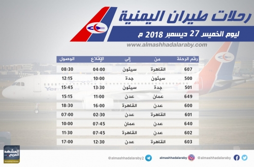 المشهد العربي ينشر جدول مواعيد رحلات طيران اليمنية ليوم غد الخميس 27 ديسمبر 2018 م :
