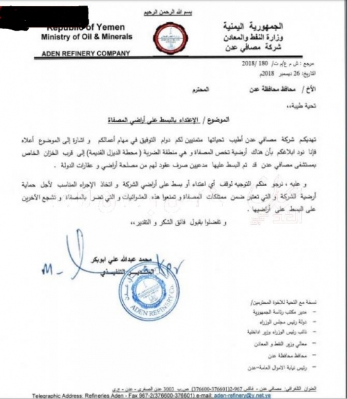 تفاصيل استغاثة مصافي عدن بشأن التعدي على أراضيها (وثيقة)