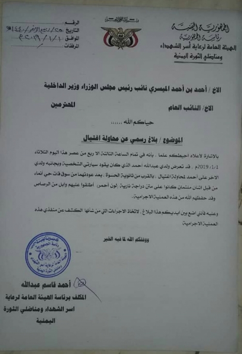 قدم أحمد قاسم عبدالله، المكلف برئاسة الهيئة العامة لرعاية أسر الشهداء ومناضلي الثورة، اليوم الثلاثاء، بلاغا للأجهزة الأمنية بعد محاولة اغتيال اثنين من أبنائه (عبدالله وعلي).