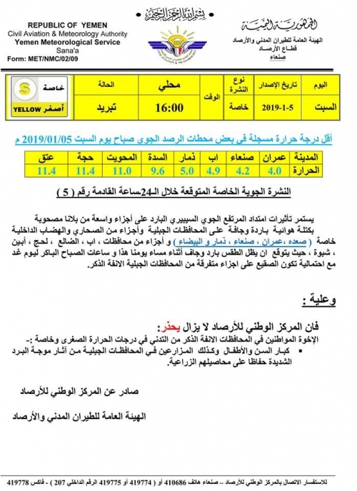 يقدم «المشهد العربي» لقرائه أخبار الطقس ودرجات الحرارة المتوقعة غدًا الأحد والموافق 6 يناير 2019 في اليمن.