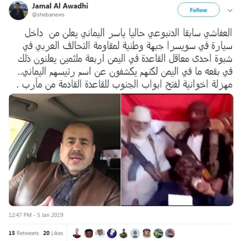 وأضاف العواضي، في تغريدة على موقع التواصل الاجتماعي "تويتر"، "أن تصوير اليماني فيديو من داخل سيارته في سويسرا، تأسيس الجبهة الوطنية للمقاومة في منطقة تتحرك وتهاجم فيها القاعدة كل من يختلف معها ولا يتفق مع منهجها الدموي المتطرف، ويلحقه فيديوا لملثمين مسلحين في مكان ما في اليمن يؤكدون دعوته ورئاسته لهذه الجماعة وذكروه بالإسم.