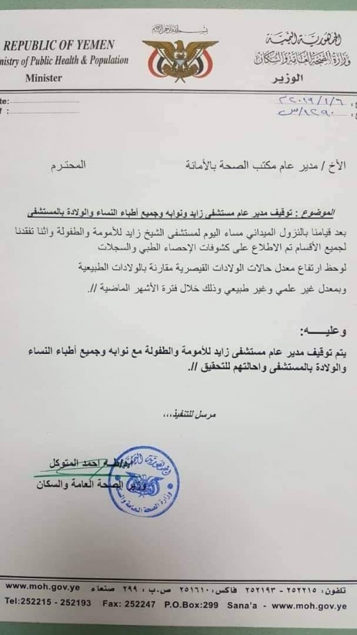 وأظهرت مذكرة أصدرها وزير الصحة في حكومة المليشيات الغير معترف بها، بتوقيف مدير عام مستشفى زايد للأمومة والطفولة ونوابه وجميع أطباء النساء والولادة وإحالتهم للتحقيق.