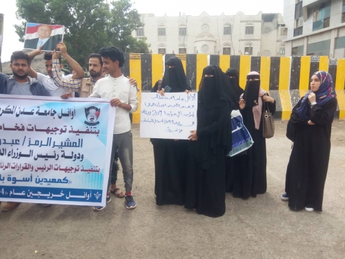 احتج أوائل الطلبة بجامعة عدن من خريجي دفعتي 2014-2015 و2015-2016، اليوم الأربعاء، أمام قصر المعاشيق بمديرية صيرة بالعاصمة عدن؛ للمطالبة بتوظيفهم بناءً على الحق الذي كفله لهم القرار الجمهوري المعمول به في الجامعات الحكومية "توظيف أوائل الجامعات".