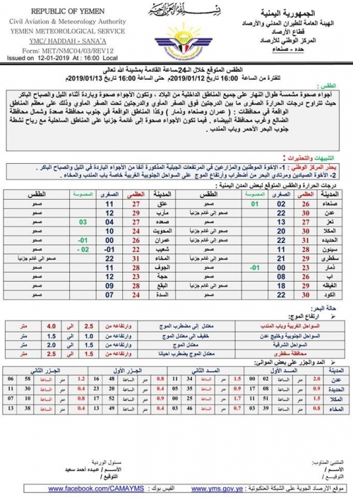 أعلن المركز الوطني للأرصاد الجوية، عن حالة الطقس ودرجات الحرارة في اليمن المتوقعة غدًا الأحد الموافق 13 يناير 2019.