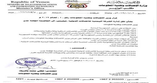 قرار من وزير الاتصالات بشأن شركة تليمن ونقلها إلى عدن (وثيقة)