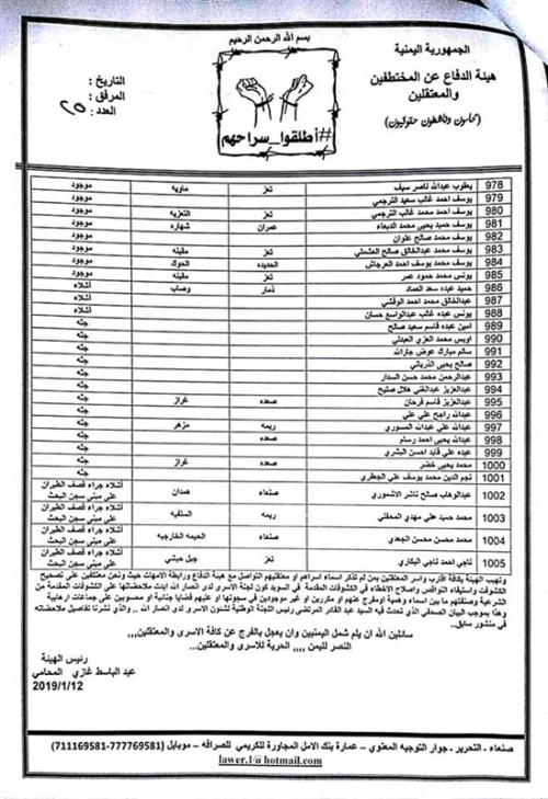 نشرت هيئة الدفاع عن المعتقلين والمختطفين في صنعاء، كشوفاً تضم أسماء ألف أسير ومختطف قالت إن مليشيا الحوثي الانقلابية وافقت على إطلاق سراحهم ضمن صفقة تبادل أسرى بمختطفين والتي أبرمت في مشاورات السويد.