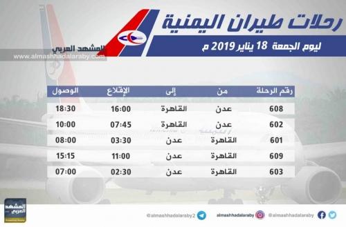 ينشر " المشهد العربي " جدول مواعيد الرحلات الجوية لطيران اليمنية ليوم غد الجمعة 18 يناير 2019م: