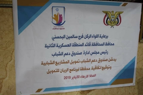 وعقب ذلك، رعي المحافظ توقيع اتفاقية محفظة لدعم الشباب عبر برنامج الريان للتمويل، التابع لجمعية النهضة بوادي حضرموت بين الصندوق والبرنامج؛ للإسهام في توفير فرص عمل للشباب ومشروعات مدرّة للدخل وتحسين مستواهم المعيشي وإكسابهم مهارات جديدة في سوق العمل.