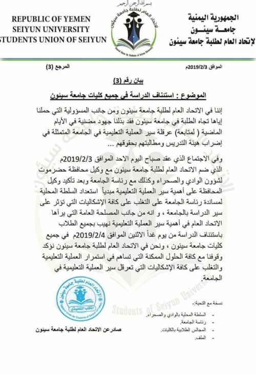 وشدد الاتحاد العام لطلبة جامعة سيئون، على وقوفه مع كافة الحلول الممكنة، التي تساهم في استمرار العملية التعليمية، والتغلب على كافة الإشكاليات التي تعرقل سير العملية التعليمية في الجامعة.