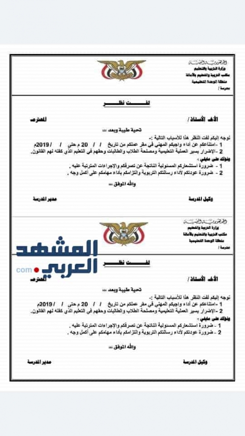 وأشارت المصادر إلى أن قيادات الحوثي في مكاتب التربية وجهت تحذيرات مكتوب للمعلمين المضربين، وهددت بفصلهم عن العمل وتوظيف متطوعين من عناصرهم بدلا عنهم .