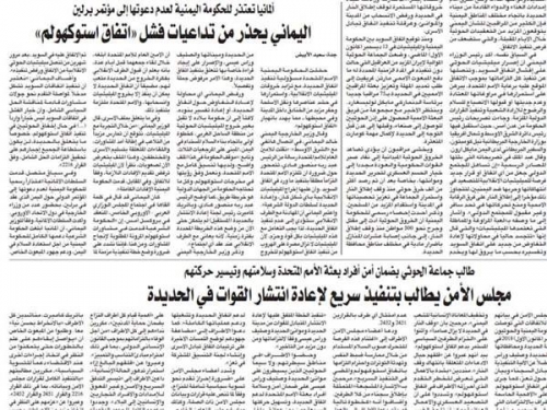 وسلطت الصحيفة الضوء على تصريحات وزير الخارجية خالد اليماني خلال اجتماع وزاري في بروكسل أمس، والتي أكد فيها أن تنفيذ اتفاق استوكهولم يشكل مدخلاً لمواصلة التقدم نحو جولات مشاورات مقبلة لمناقشة الحل الشامل، وأن الفشل في اتفاقات السويد ليس خياراً وارداً لأنه في حال إخفاق الحوثيين في تنفيذ اتفاق استوكهولم.