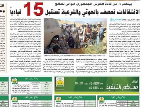 فيما أكدت صجيفة "عكاظ" السعودية أن مليشيات الحوثي الإرهابية تواجه انشقاقات كبيرة في صفوفها وسط تزايد السخط الشعبي جراء ممارساتها وانتهاكاتها المستمرة ضد المدنيين والقيادات اليمنية داخل صنعاء وخارجها.