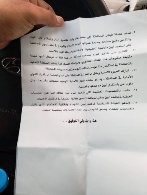 9/ ندعو كافة قبائل المحافظة إلى صلح عام ونبذ ظاهرة الثأر وإصلاح ذات البين والتآخي وفتح صفحة جديدة عنوانها إشاعة السلام والوئام في كل ربوع المحافظة لكي تستعيد أبين مكانتها الحقيقية وان تدشين مرحلة البناء والإعمار.
