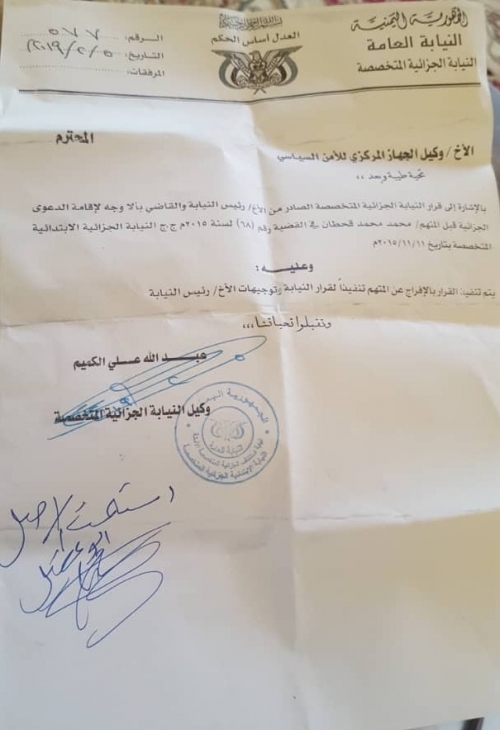 ونقل موقع "المصدر اون لاين"، عن رئيس هيئة الدفاع عن المختطفين والمخفيين قسراً المحامي عبد الباسط غازي، قوله إن مندوب النيابة الجزائية وفريق الدفاع سلموا مذكرة الإفراج عن السياسي محمد قحطان إلى الأمن السياسي.