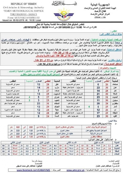 يقدم «المشهد العربي» لقرائه أخبار الطقس ودرجات الحرارة المتوقعة غدًا السبت والموافق 9 فبراير 2019 في اليمن.