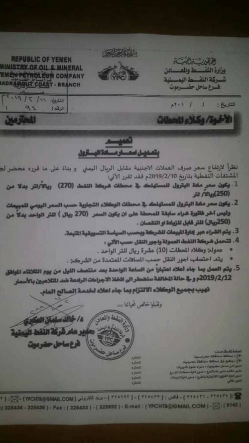 وجاءت التسعيرة الجديدة نتيجة ارتفاع سعر صرف العملات الأجنبية مقابل الريال اليمني، وبناءً على السياسة المتزنة لشركة النفط بساحل حضرموت.