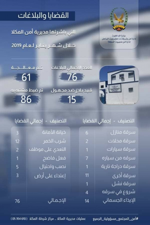 كشفت مديرية أمن المكلا عاصمة حضرموت عن تلقيها ٧٦ بلاغًا خلال شهر يناير الماضي، قامت بمعالجة ٦١ منها، وسُجل ١٥ بلاغًا ضد مجهول.