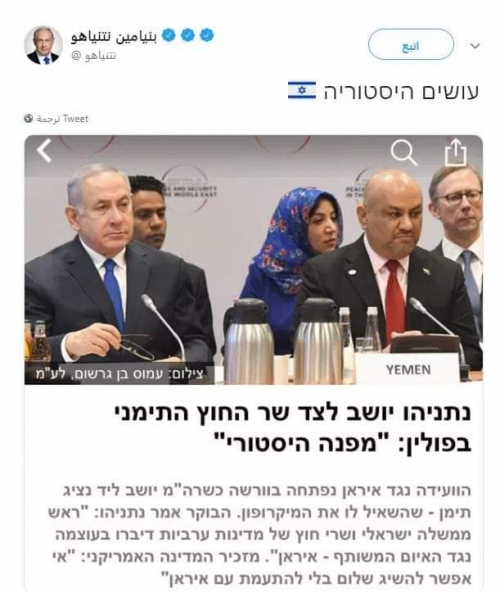 اليماني يُثير الجدل في مؤتمر وارسو بسبب صورة
