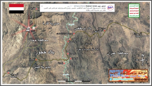نشر حساب "خرائط حروب الشرق الأوسط"، اليوم، صورة لآخر مستجدات المعارك بين قبائل حجور ومليشيات الحوثي.