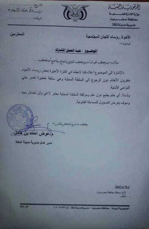 السلطة المحلية بالمكلا تصدر تعميماً هاماً لرؤساء اللجان المجتمعية (وثيقة)