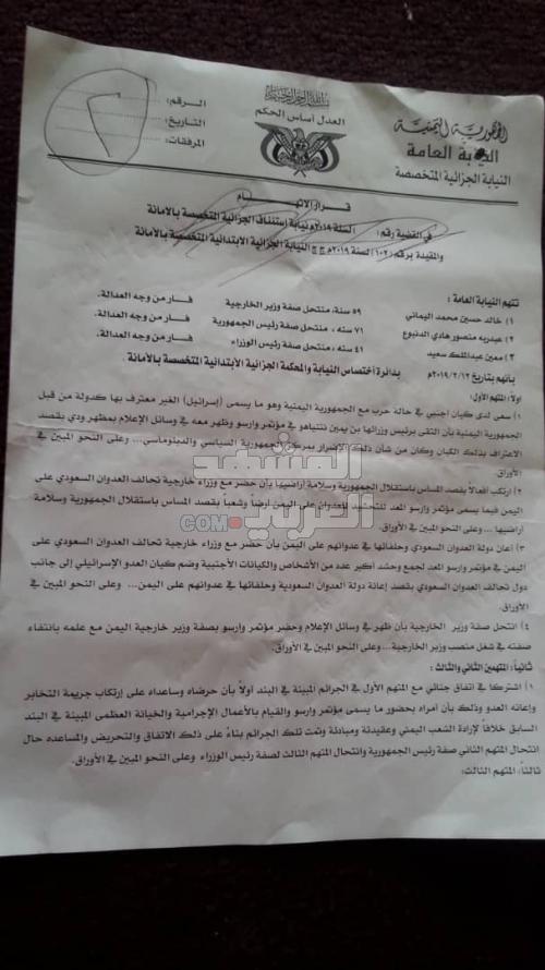 وطالبت (النيابة الحوثية) - حسبما أظهرت الوثائق - بالحجز على أموال المسؤولين الثلاثة ومصادرتها، حيث وجّهت اتهاماً للوزير اليماني بأنّه "سعى لدى كيان أجنبي في حالة حرب مع الجمهورية اليمنية وهو ما يسمى إسرائيل الغير معترف بها كدولة من قِبل الجمهورية اليمنية بأن التقى برئيس وزرائها بنيامين نتنياهو في مؤتمر وارسو وظهر معه في وسائل الإعلام بمظهر ودي يقصد الاعتراف بذلك الكيان وكان من شأن ذلك الإضرار بمركز الجمهورية السياسي والدبلوماسي".
