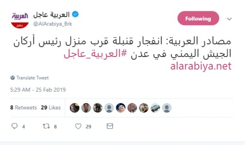 انفجار قنبلة قرب منزل رئيس أركان الجيش اليمني بعدن