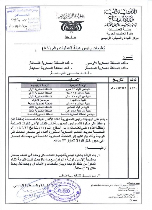 أشار المصدر الاعلامي ذاته إلى أن انتقال الكتائب سيكون للمنطقة العسكرية الخامسة في محافظة مارب وهي كتيبة اللواء 37 مدرع واللواء 23 ميكا و كتيبة اللواء 135 مشاة.