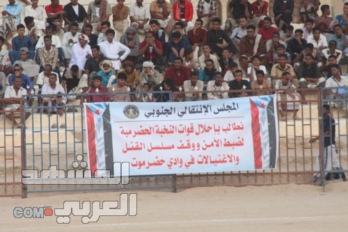 رفع أعضاء المجلس الانتقالي الجنوبي عدد من اللافتات التي تدين وترفض القتل والانفلات الأمني في وادي حضرموت، وذلك خلال المواجهة التي جمعت عصر اليوم ناديي سلام الغرفة، واتحاد سيئون وأقيمت على ملعب الشهيد جواس بمدينة سيئون.