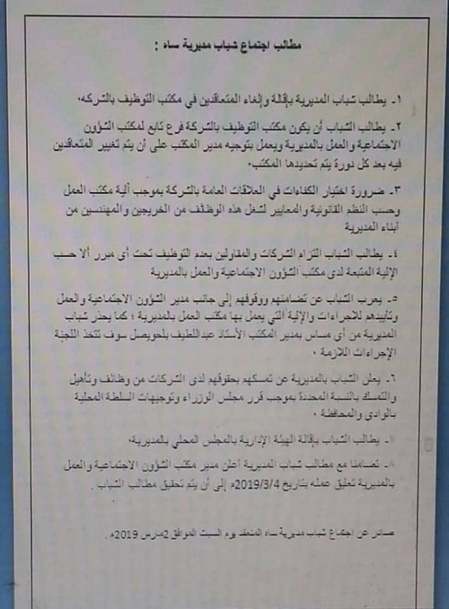 وتضمنت مطالب الشباب إقالة وإلغاء المتعاقدين في مكتب التوظيف بالشركة وأن يكون مكتب التوظيف بالشركة فرع تابع لمكتب الشؤون الاجتماعية والعمل بالمديرية.