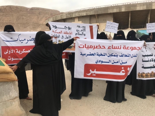ورفع النساء خلال الوقفة لافتات تعبر عن مطالبتهن للتحالف العربي، من تمكين قوات النخبة الحضرمية وأبناء حضرموت من ملف الأمن في الوادي، لإيقاف نزيف الدم المراق في مناطق وادي وصحراء حضرموت.