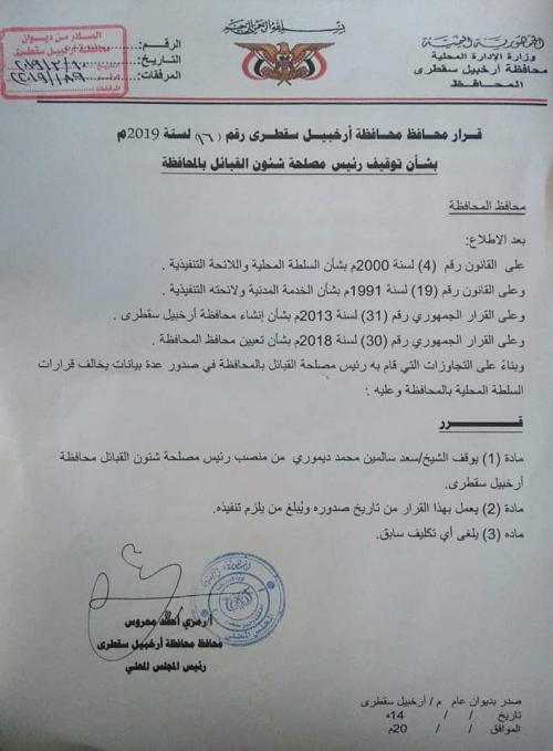 قرار بتوقيف رئيس مصلحة القبائل في محافظة أرخبيل سقطرى (وثيقة)