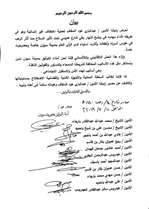 وإزاء هذا العمل اللاقانوني واللاإنساني فإننا نحن أمناء التوثيق بمدينة سيئون ندين ونستنكر مثل هذه الأساليب المخالفة لشريعتنا السمحاء والدستور والقوانين النافذة، وهي أساليب تهدد الأمن والاستقرار الاجتماعي.