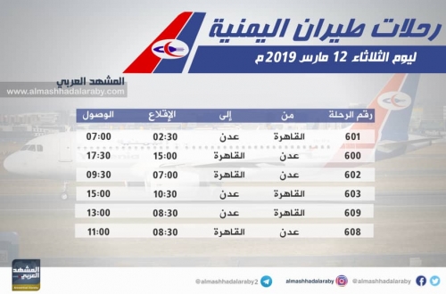 يٌقدم "المشهد العربي" لقرائه جدول مواعيد رحلات طيران اليمنية ليوم غدٍ الثلاثاء الموافق 12 مارس 2019.