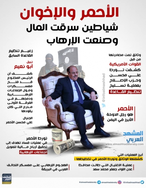 يرصد "المشهد العربي"، بالأرقام والتفاصيل جرائم نائب الرئيس هادي علي محسن الأحمر بالتعاون مع تنظيم الإخوان الإرهابي، والتي تنوعت ما بين سرقة أموال اليمنيين وتمويلهم العمليات الإرهابية.