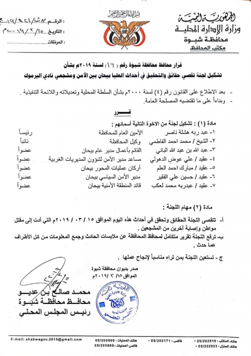 بالأسماء.. تشكيل لجنة تقصي حقائق في أحداث بيحان (وثيقة)