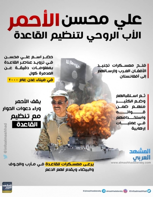 يرصد "المشهد العربي" تفاصيل التعاون الخفي بين على محسن الأحمر وتنظيم القاعدة باليمن، من خلال التعرف على تفاصيل المعسكرات التي يرعى الأحمر تنظيمها للتنظيم الإرهابي في عدد من المحافظات اليمنية.