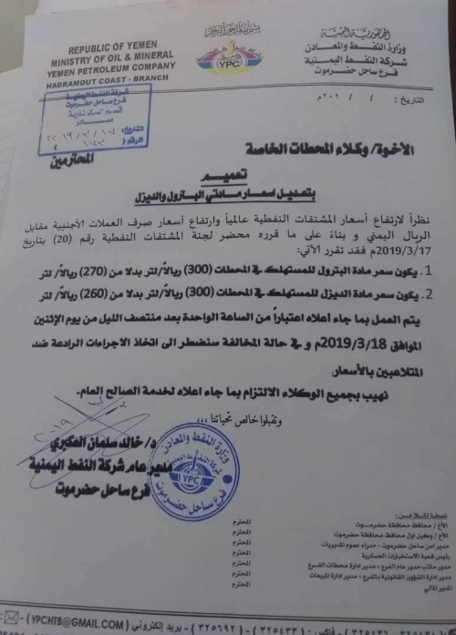 ارتفاع جديد في أسعار المشتقات النفطية بحضرموت (وثيقة)