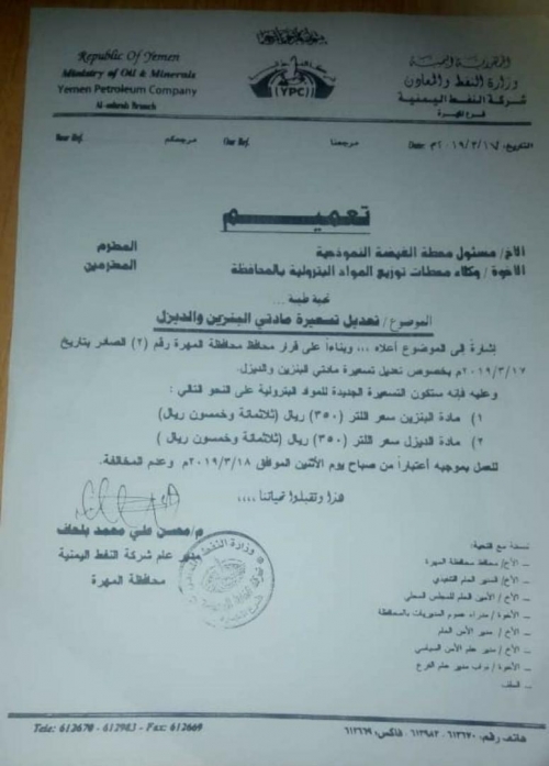 ارتفاع جديد في أسعار البترول والديزل بالمهرة (وثيقة)