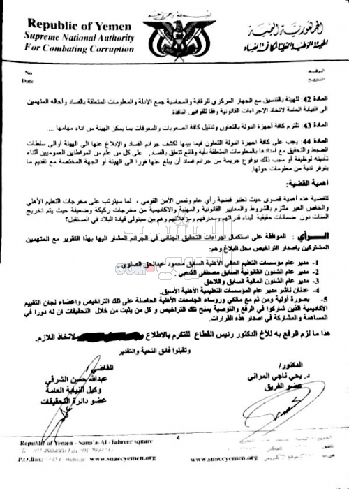 وأوصى التقرير، الذي حصل "المشهد العربي" على نسخة منه، باستكمال التحقيقات مع مسؤولي الوزارة، كما اتهم التقرير الوزير حازب بعرقلة استكمال التحقيق في القضية وإعاقة التحقيق مع المسؤولين بما فيهم مدير مكتبه محمود الصلوي .