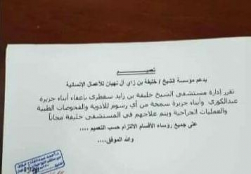 قررت إدارة مستشفى خليفة بن زايد في جزيرة سقطرى بإعفاء أبناء جزيرة عبدالكوري وأبناء جزيرة سمحة من أي رسوم للأدوية والفحوصات الطبية والعمليات الجراحية.