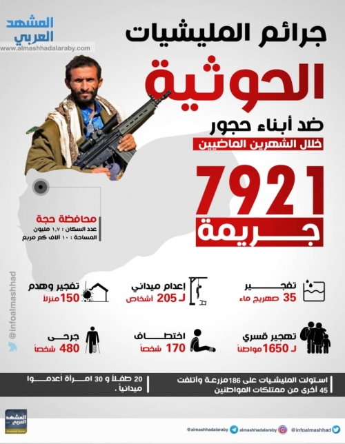 ويسلط موقع "المشهد العربي" الضوء من خلال الإنفوجراف على الجرائم التي ارتكبتها المليشيات بحق قبائل حجور خلال تلك الفترة: