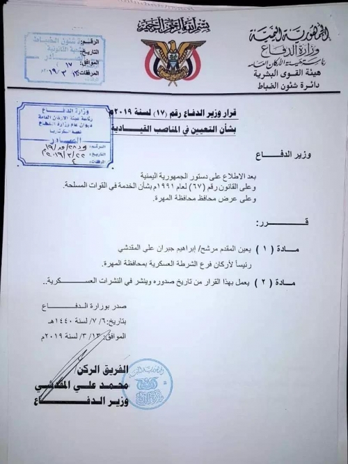 أعرب الناشط السياسي، أحمد الربيزي، عن غضبه من قرار وزير الدفاع المدني، محمد علي المقدشي، بتعيين أحد أقاربه مسؤولاً للشرطة العسكرية في محافظة المهرة.