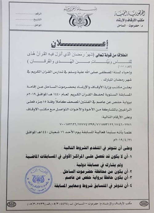أعلن مكتب وزارة الأوقاف والإرشاد بحضرموت الساحل عن إقامة المسابقة السنوية لحفظ القرآن الكريم للعام الهجري الجاري 1440 الموافق لعام 2019 ميلادية، وذلك برواية حفص عن عاصم في فئة المصحف الكامل وفئة 15 جزء.