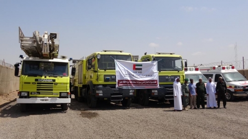 يأتي هذا استمراراً للدعم السابق الذي قدمته دولة الإمارات للدفاع المدني بعدد 16 سيارة متنوعة (إطفاء وإنقاذ وإسعاف).