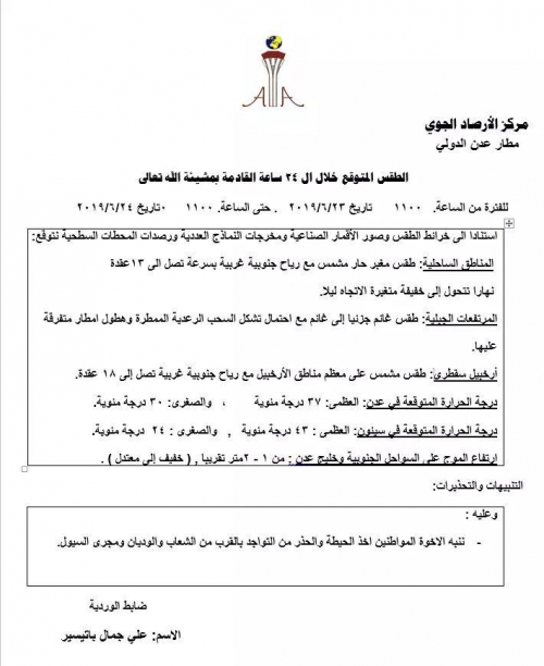 وعن درجة الحرارة المتوقعة في العاصمة عدن توقع بأن تكون العظمى 37 درجة مئوية، والصغرى 30 درجة مئوية.