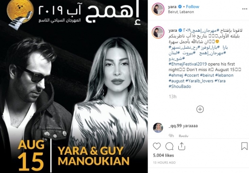 ونشرت يارا صورة للبوستر الدعائي للحفل، وعلقت: "لاقونا بافتتاح مهرجان إهمج 2019، بليلته الأولى بتاريخ 15 آب، ناطرينكم إن شاء الله بأجمل سهرة".