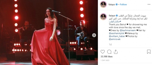 حرصت الفنانة السورية فايا يونان، على توجيه الشكر لحضور الحفل الذي أحيته في بيروت الأربعاء الماضي 26 يونيو.