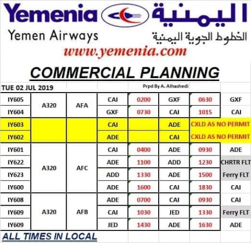 خط الرحلة: عـدن- القاهرة. الإقلاع: 07:00 صباحا. الوصول: 09:30 صباحا .