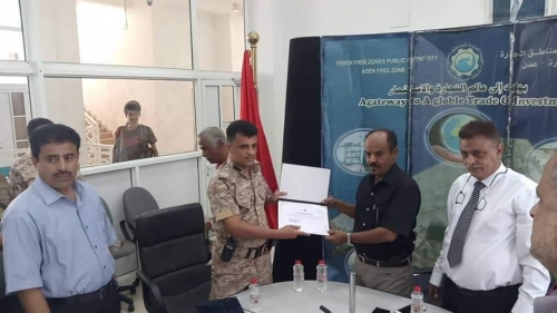 كرمت المنطقة الحرة بالعاصمة عدن، اليوم الأربعاء، المقدم أحمد محمود أبو أصيل قائد كتيبة حزم 1 التابعة لألوية الدعم والإسناد، وذلك تقديرا للجهود التي بذلتها الكتيبة في تأمين وحماية مساحات وأراضي المنطقة الحرة ومينائها الحيوي ومحمية الحسوة من المعتدين على أراضي المنطقة العامة .
