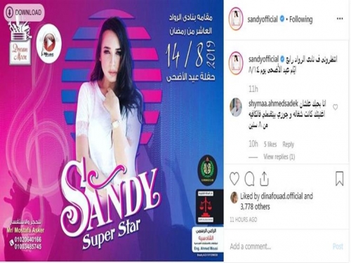 ونشرت ساندي بوستر حفلها عبر حسابها على "إنستجرام" وعلقت قائلة: "انتظروني في نادى الرواد رابع أيّام عيد الأضحى".